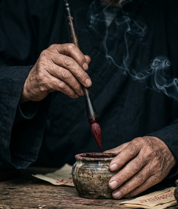 Before any THUNDER VOID artifact is released into the world, it undergoes the solemn Taoist ritual of Kaiguang (开光). The master closes his eyes, his fingers gently tracing the artifact, sensing its inherent Chi. Using ancestral brushes and sacred vermilion ink, the chanting begins. The breathing is slow, steady, and patient.